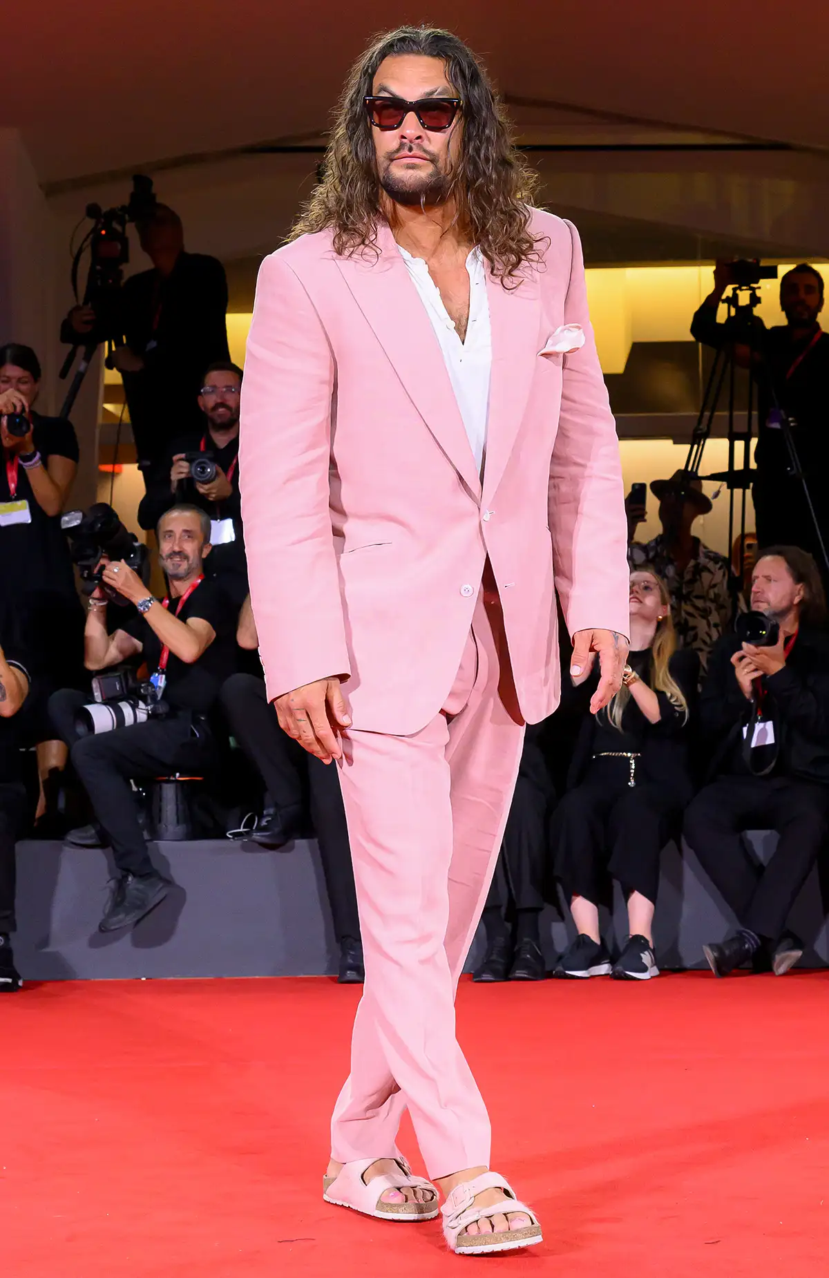 Джейсон Момоа здивував гостей Венеційського кінофестивалю яскравим образом у рожевому костюмі та з педикюром, ставши однією з головних сенсацій червоної доріжки.