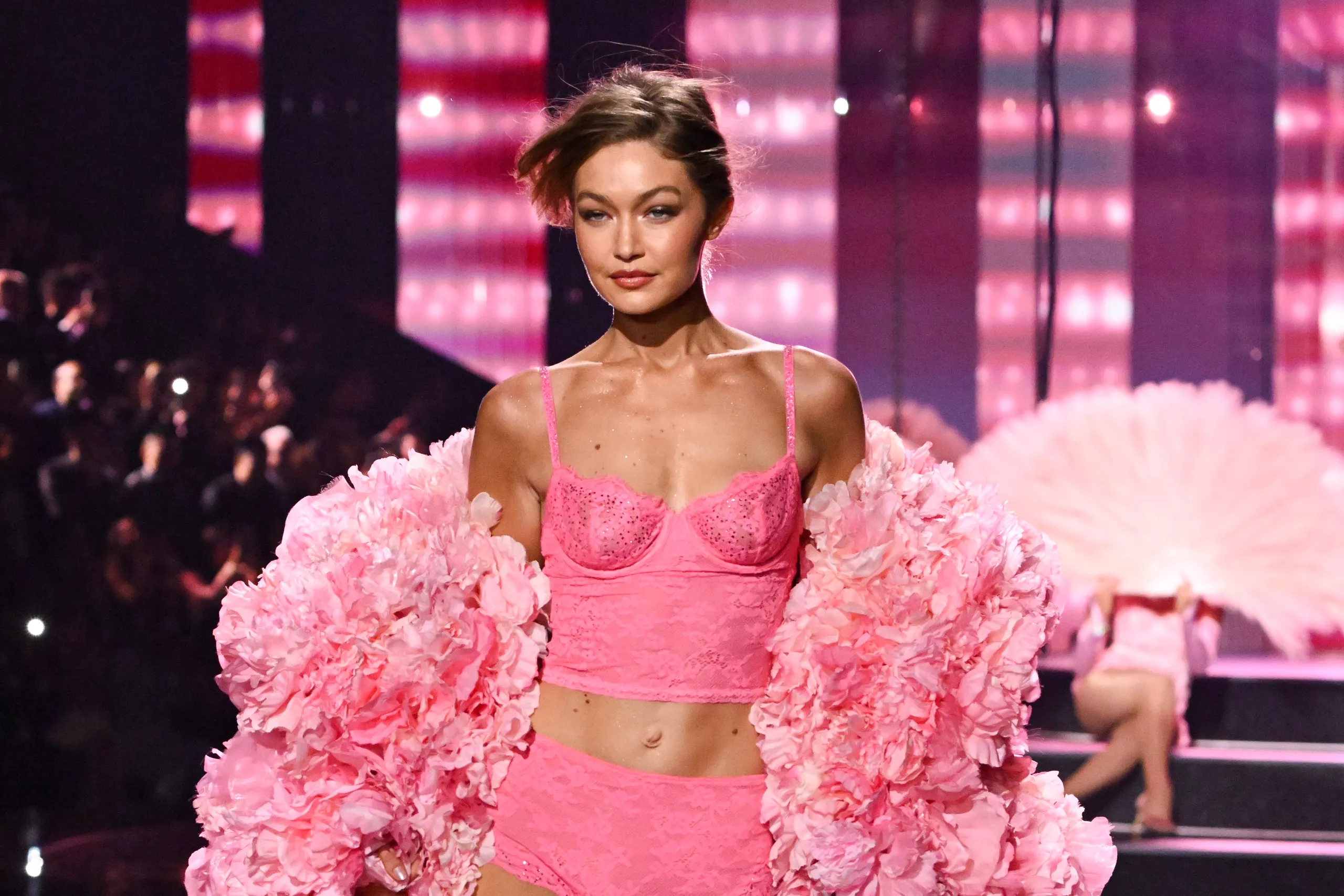 Гіґі і Белла, як сестри й ветерани модної сцени, зайняли свої позиції на подіумі окремо, але їхня спільна присутність створила атмосферу родинного тріумфу. Гіґі відкривала шоу в рожевому ансамблі, доповненому плащем з квітів, а потім повернулася вже в білому образі з крильми. Белла вийшла в червоному сатиновому комплекті з чорними елементами та у фінальній частині перевтілилася в блискучий сріблястий комплект з білими квітковими крилами.